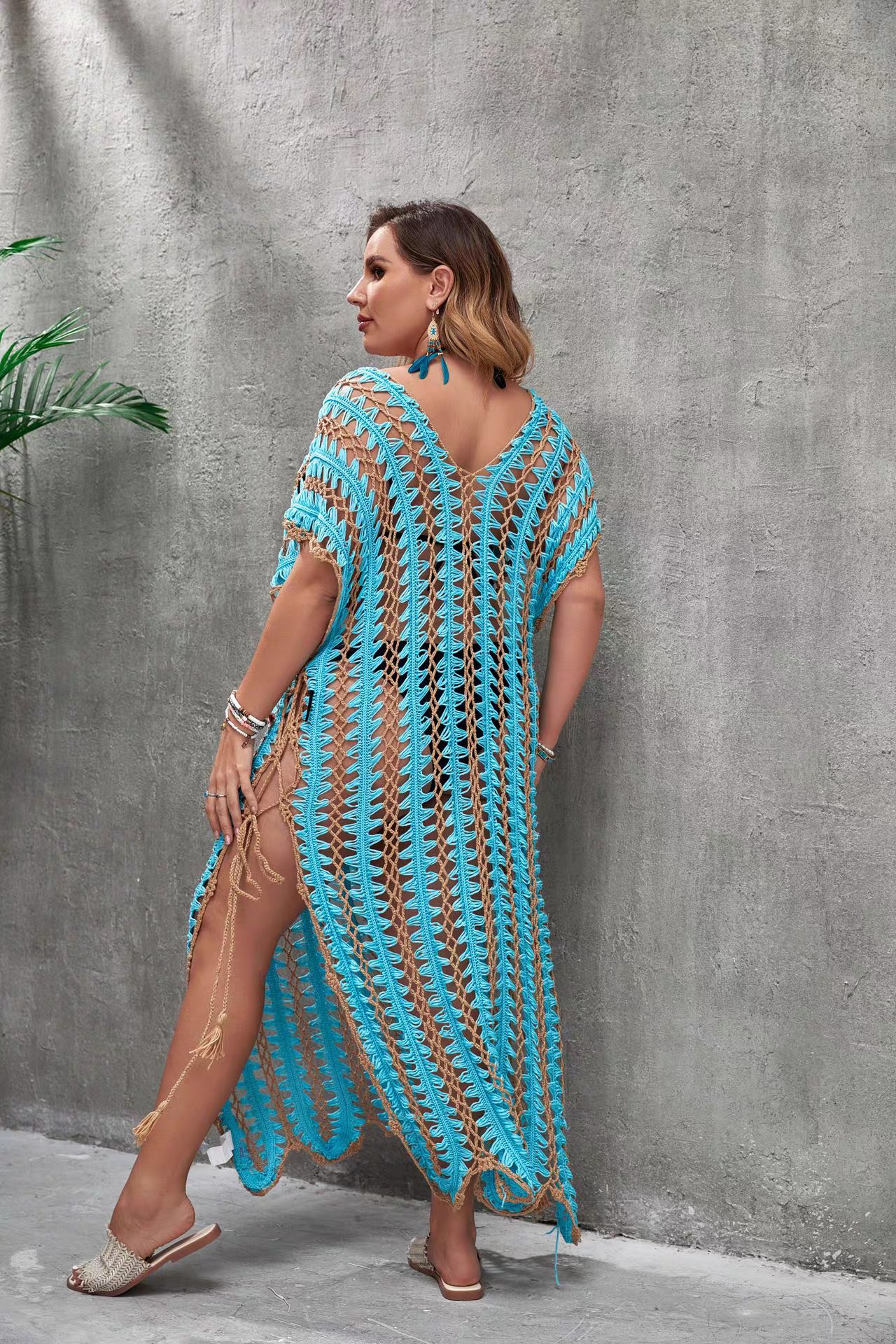 • Plus size new beach long dress hand hook hollow-out sexy matching color sunscreen smock knitted bikini smock